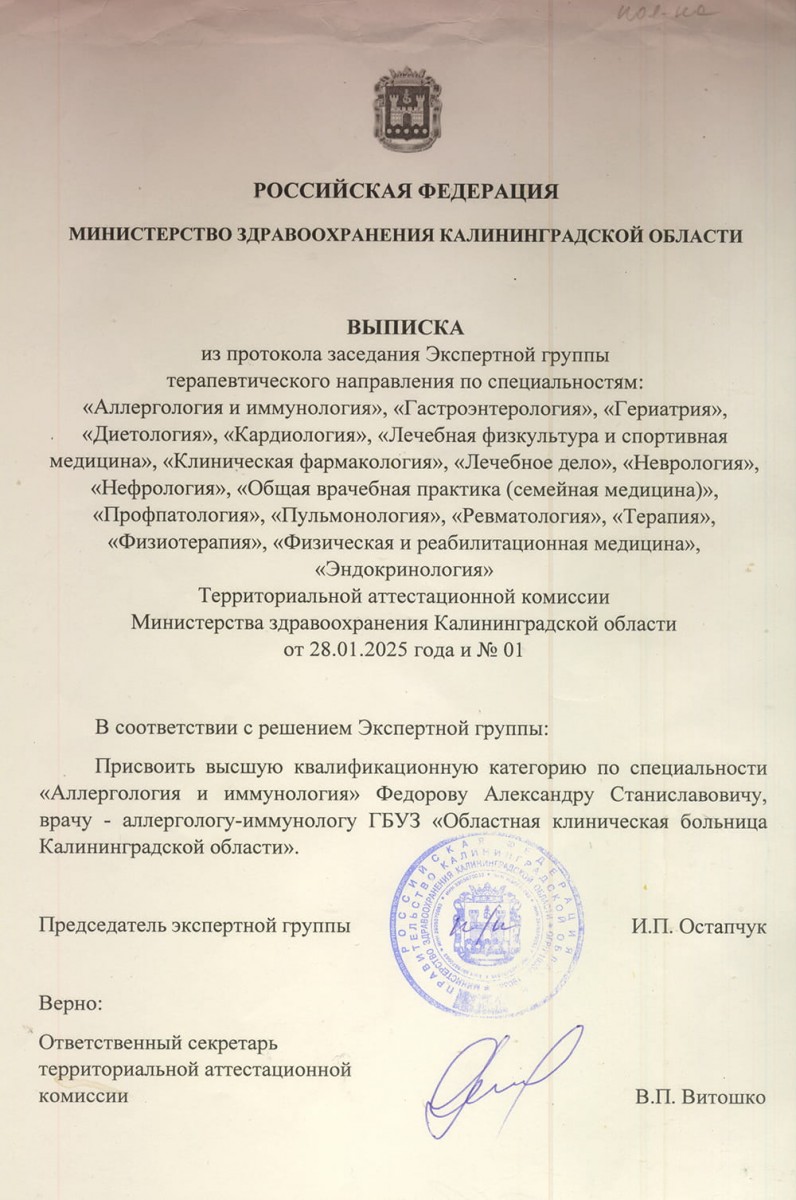 - 2007 г. Сертификат специалиста по специальности «Аллергология и иммунология», Северозападный государственный медицинский университет им. И. И. Мечникова, срок действия до 07.10. 2022 г.