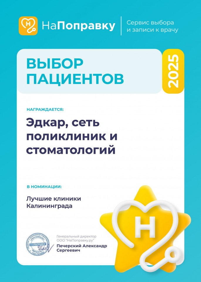 Система клиник “Эдкар” в числе лучших! Мы получили премию «Выбор пациентов 2025» от сервиса «НаПоправку»!