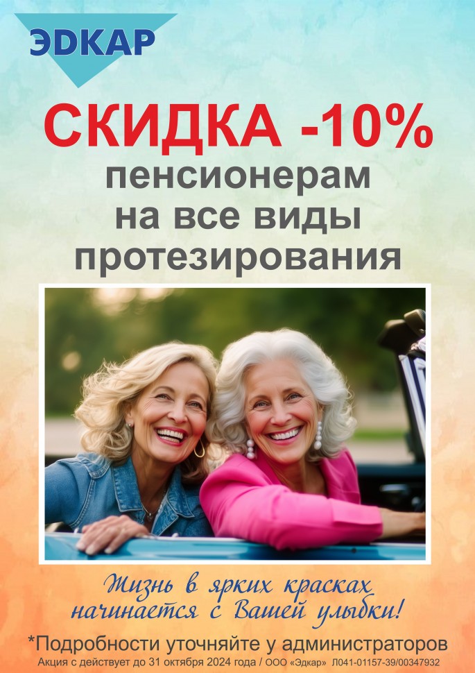 Воспользоваться предложением можно в клиниках "Эдкар" на пр. Калинина, 28 и "Эдкар Бета" на ул. Артиллерийской, 22 при предъявлении пенсионного удостоверения.